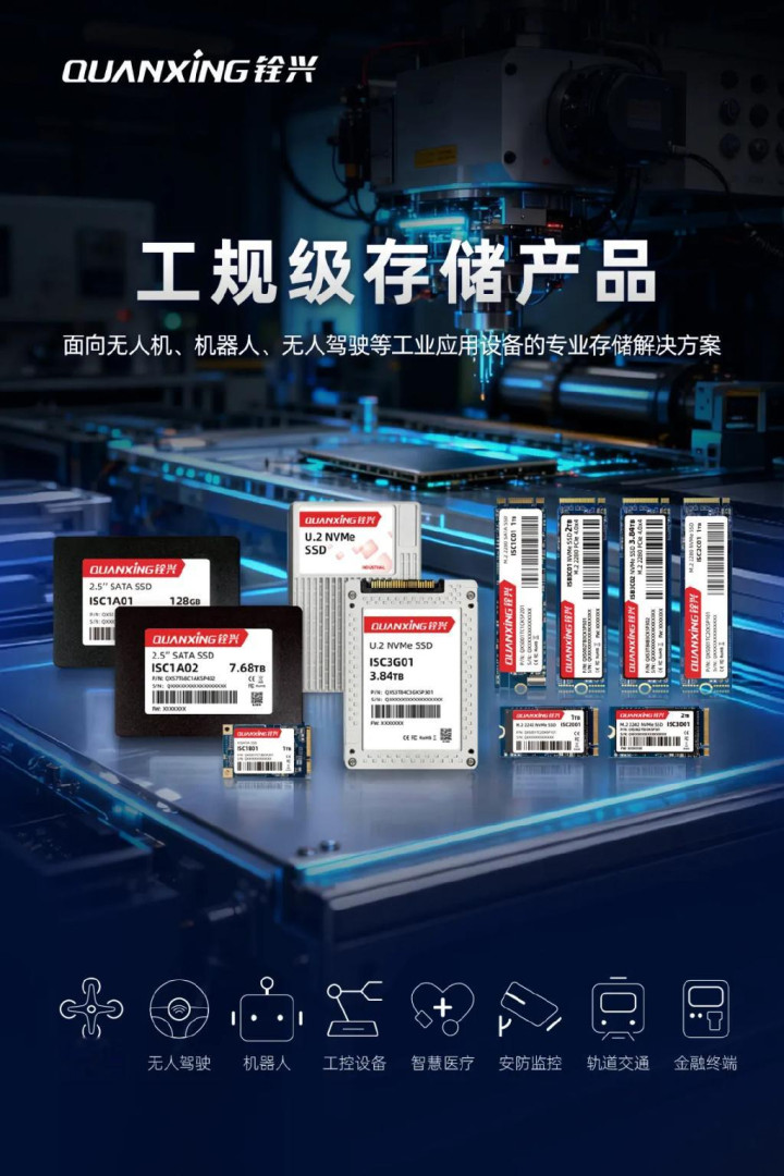 铨兴科技构建了覆盖企业级、工规级、车规级和消费级的全系列高端存储产品线,实现自主可控的高标准量产与进口替代,为多样化的智能应用场景提供高性能存储支撑。