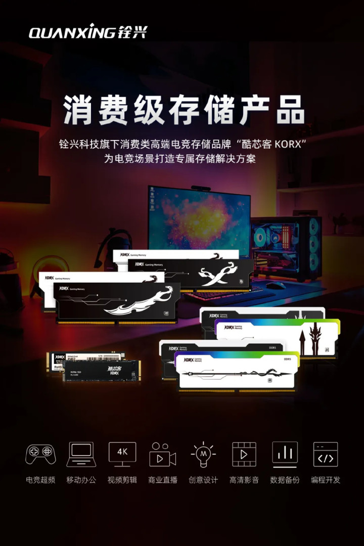 铨兴科技旗下消费类高端电竞存储品牌“酷芯客KORX”,为电竞场景打造专属存储解决方案。产品具备高速传输、电竞级低延迟性能与大容量存储等优势,设计简洁易用且兼容性广泛,为用户带来“即插即用”的便捷体验,同时覆盖移动办公、多媒体娱乐等日常存储场景需求。