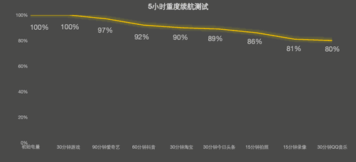 笔者采用中关村在线续航测试模型,对其进行了续航测试。在当前室温环境下,连接办公室Wi-Fi,关闭蓝牙、GPS,屏幕亮度、音量均设为50%,5小时重度使用下还有80%的电量。