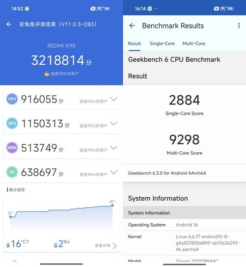 从跑分结果来看,K90安兔兔跑分可以达到321万,在Geekbench6的测试中,K90单核分数2884,多核分数达到了9298,相较于上一代产品也有明显进步。