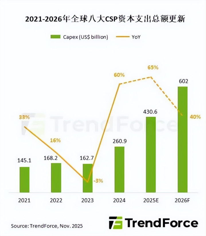 随着北美云端服务大厂(CSP)近日公布最新财报指引,TrendForce将2025年全球八大主要CSPs资本支出(CapEx)总额年增率从原本的61%,上修至65%。预期2026年CSPs仍将维持积极的投资节奏,合计资本支出将进一步推升至6,000亿美元以上,年增来到40%。
