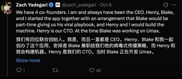 他一直都是Cal AI的CEO,Henry担任CTO,他和Henry、Blake一起打造了应用;当时的Blake正在开发Umax,所以兼职负责传播策略。