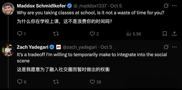 在Yadegari看来,社交是大学中最占时间的,他对此的评价是「虽然有趣,但生产力并不高」。