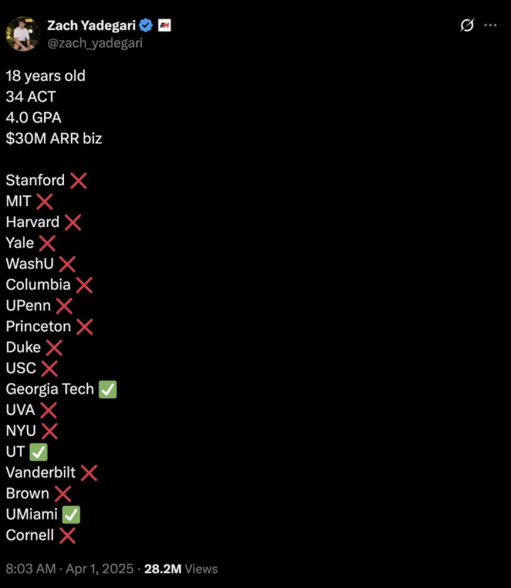 虽然拥有丰富的创业背景、GPA满分以及34分(接近满分)的ACT成绩,但Yadegari仍然收到超过十所常青藤盟校等知名学校的拒绝信,甚至连以「创业圣地」著称的斯坦福大学也未录取他。