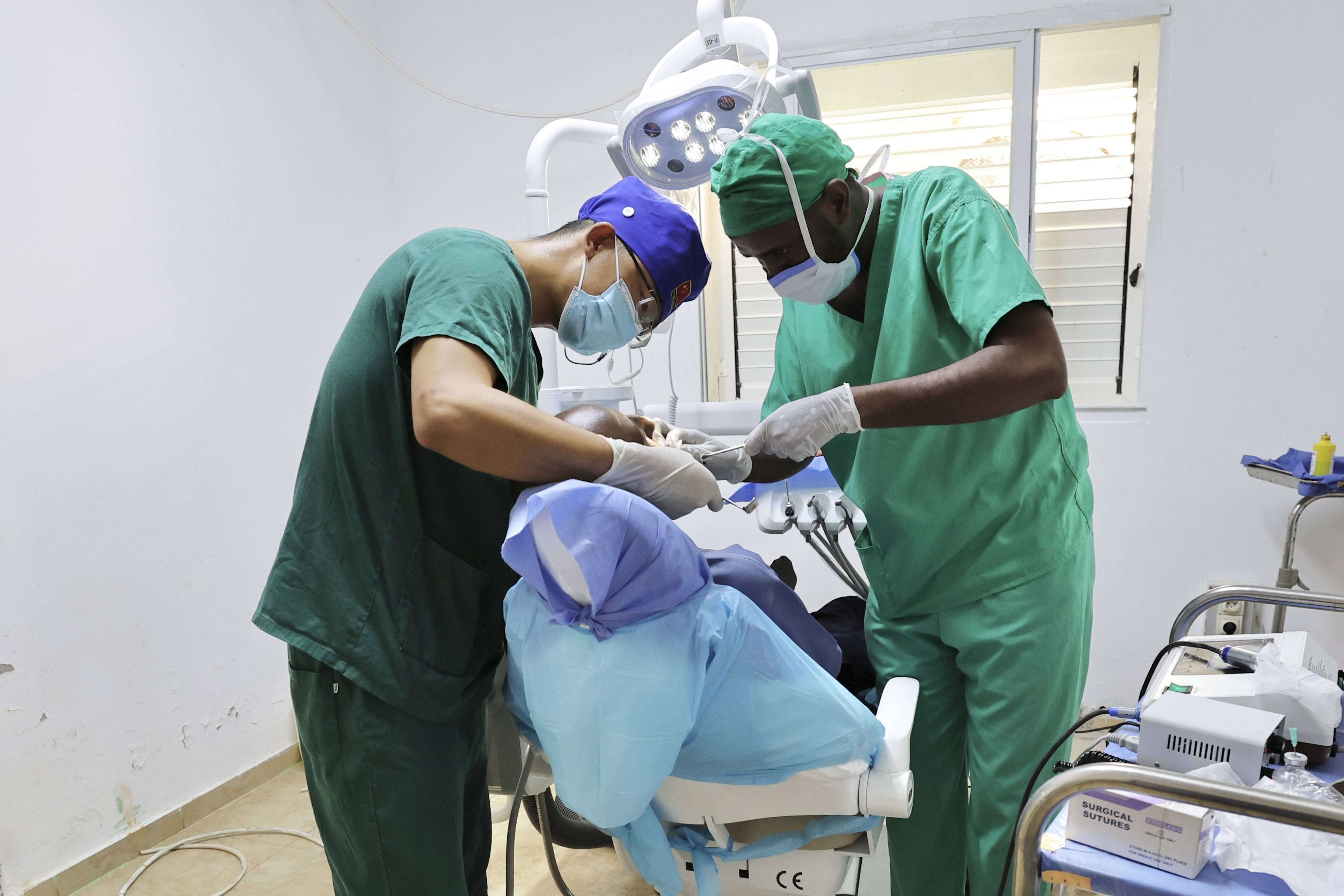 4月12日,在吉布提首都吉布提市的佩尔蒂埃医院,中国(山西)第24批援吉布提医疗队口腔颌面外科医生闫星泉(左)及当地医生为患者拔牙。新华社记者耿馨宁摄今年是中国向吉布提派出医疗队45周年。自1981年首批援吉布提医疗队启程以来,共有200余名医疗队队员接力在当地开展医疗服务,一代代队员扎根于这片热土,日复一日开展诊疗与带教工作,持续提升当地医疗服务能力。方寸诊室间,续写着跨越山海的友谊。